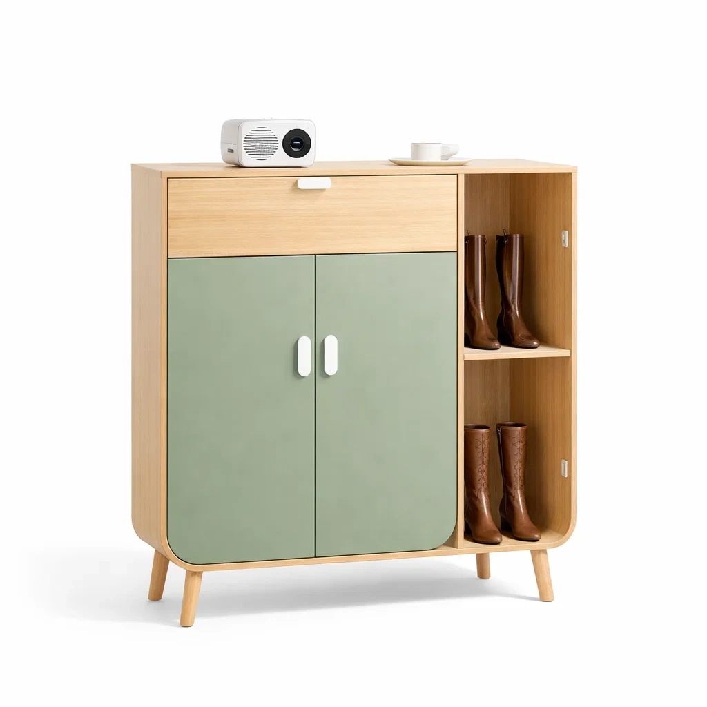 Description: Modern shoe cabinet with shelves and storage compartments designed for organizing footwear and entryway essentials. Spacious sections provide practical storage for shoes and daily items while keeping hallway areas neat and organized.