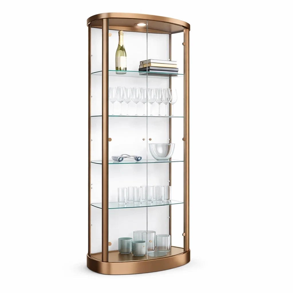 Description: Curved glass display cabinet with integrated lighting designed for showcasing glassware, collectibles and decorative items. Transparent panels provide clear visibility while the elegant frame makes it suitable for living rooms, dining areas and display spaces.